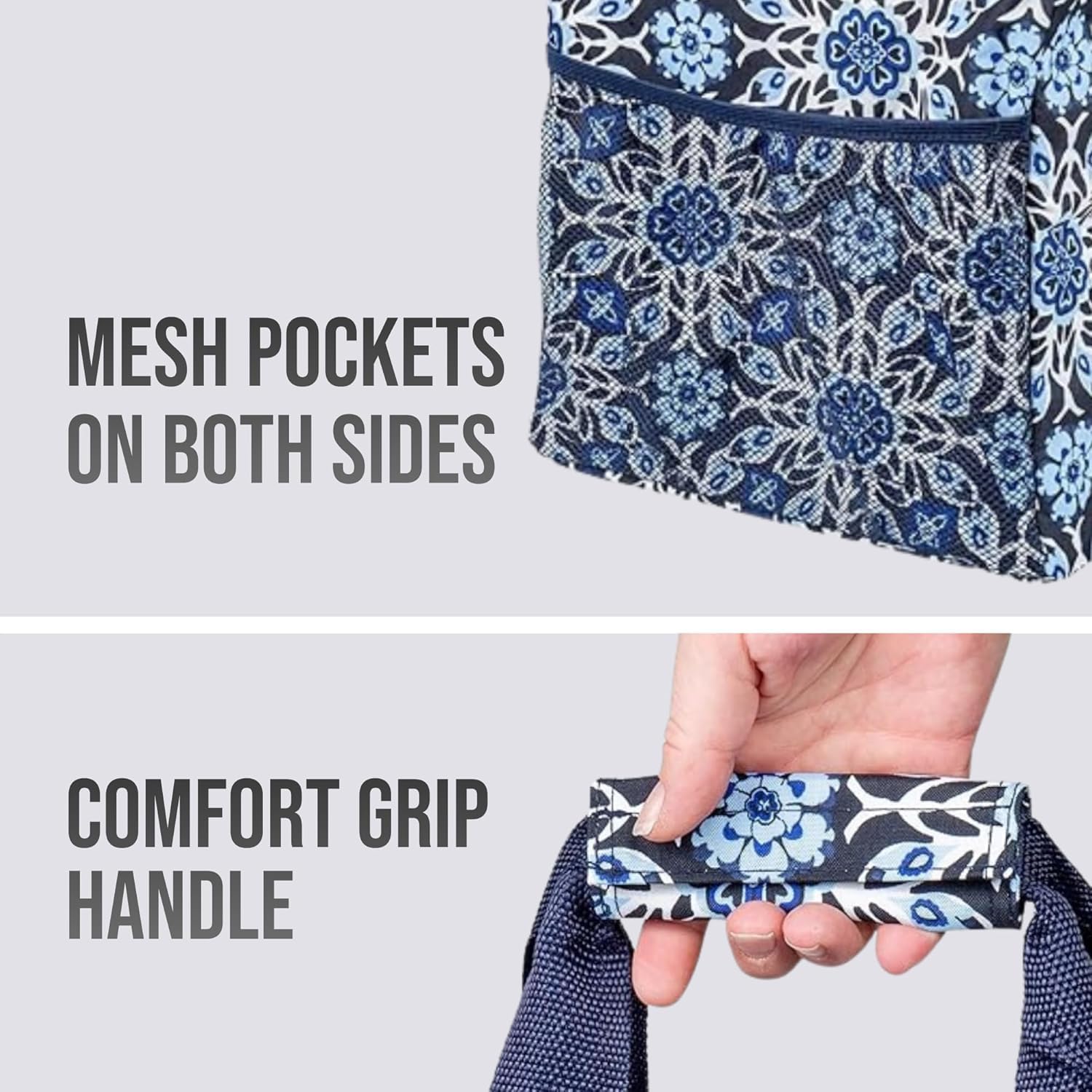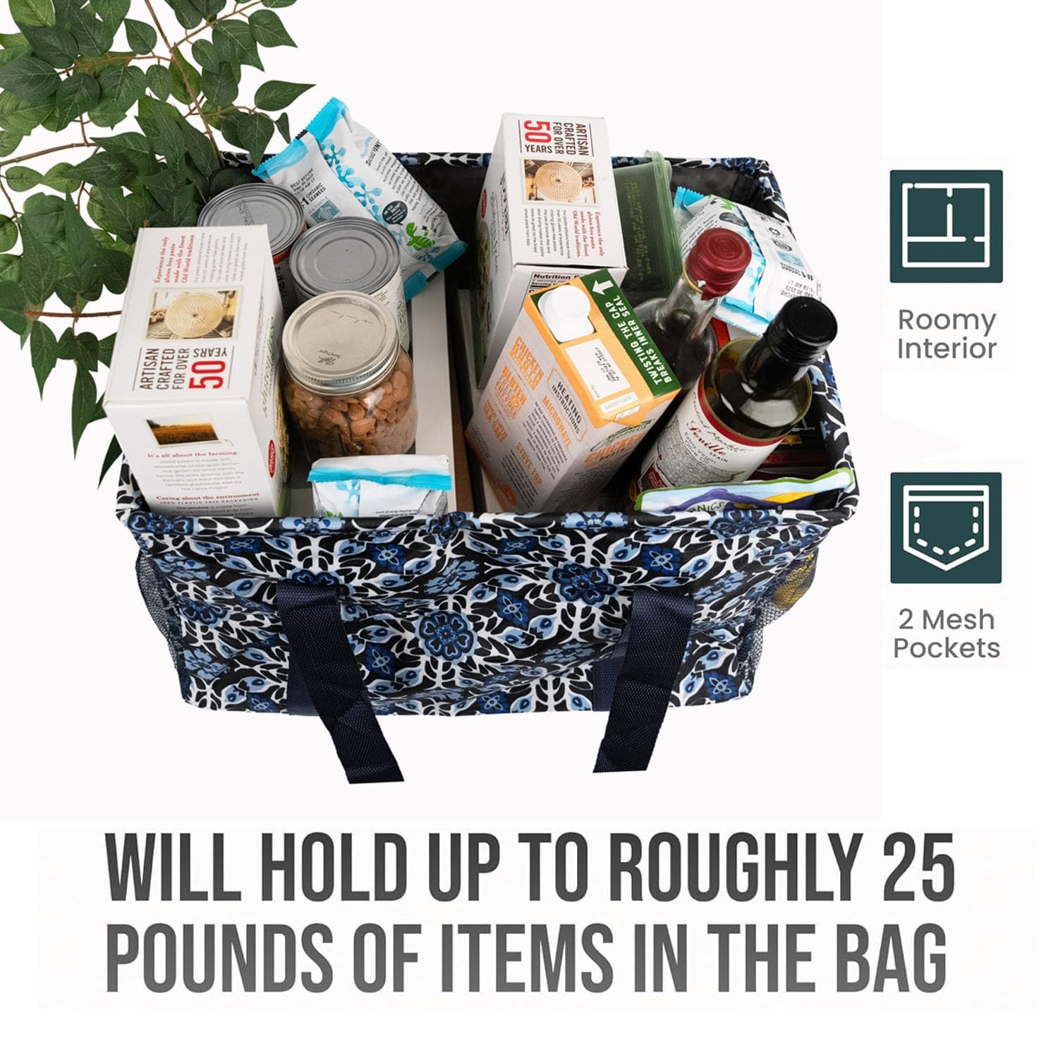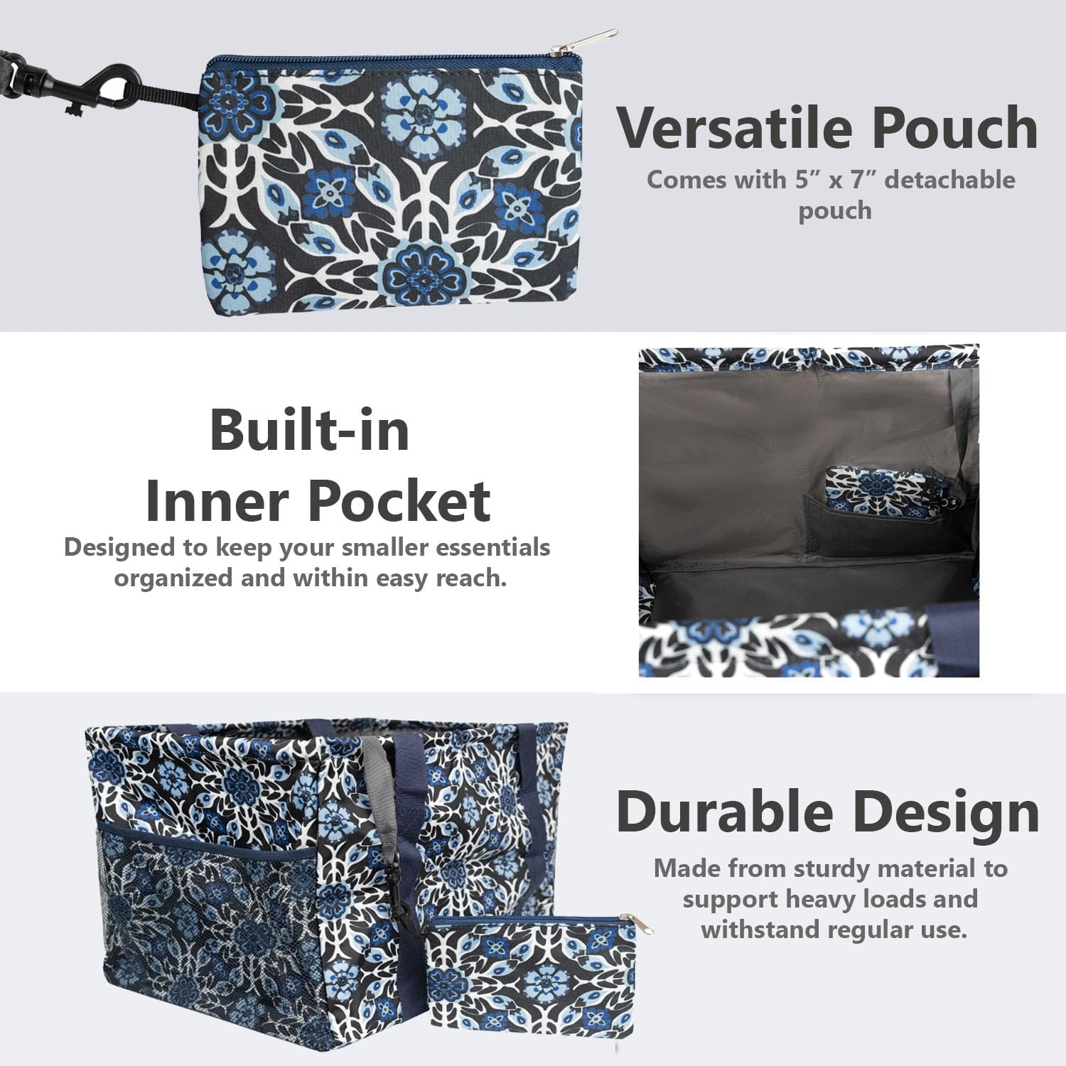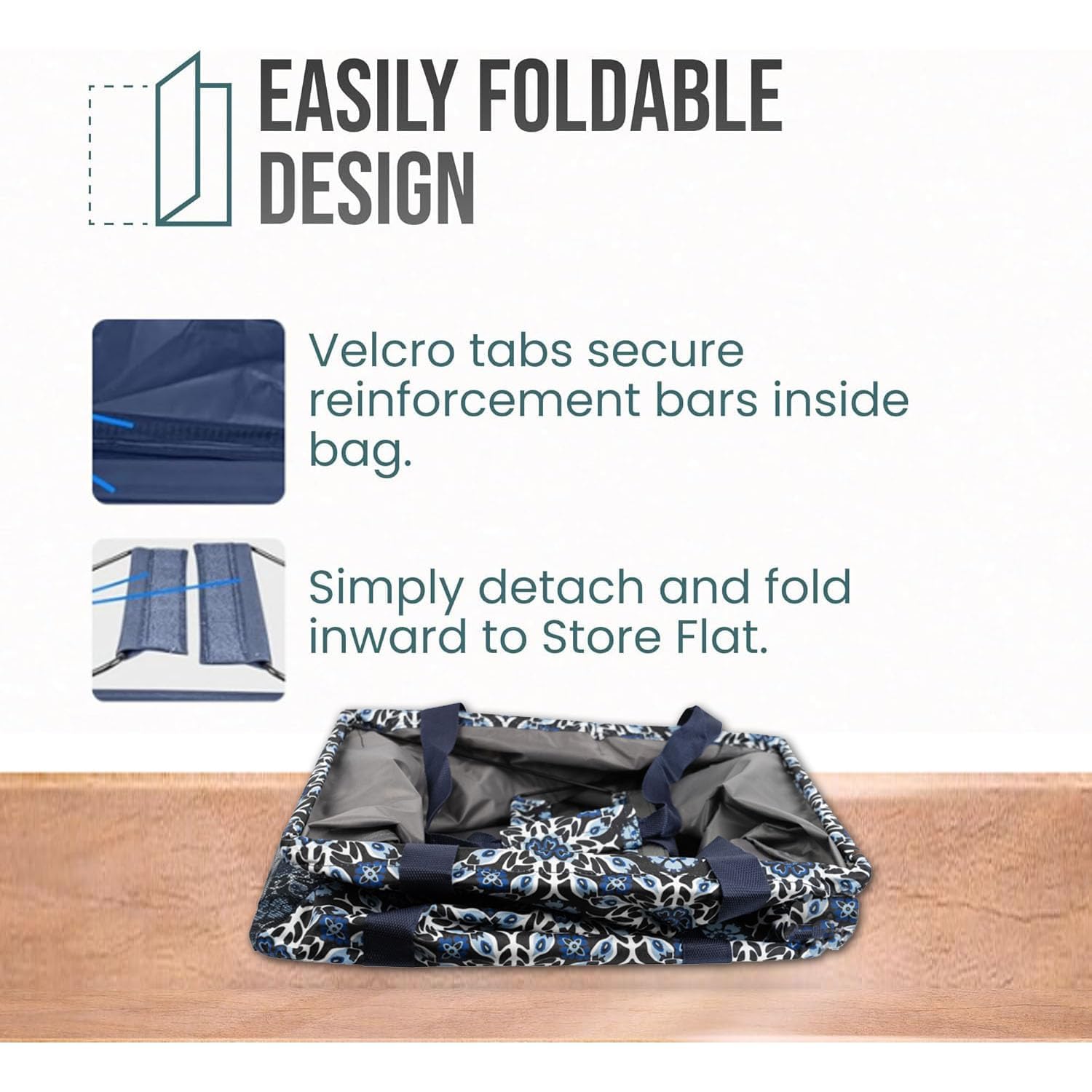 Large Utility Tote Bag - Oversized Collapsible Tote with Wire Frame - Includes 5x7 Bag with Hook - Navy Floral